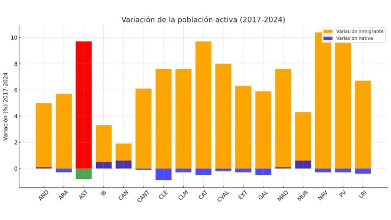 Se da la circunstancia de que, debido precisamente al envejecimiento, a la vez que se da este fenómeno de auge de población activa inmigrante, Asturias se encuentre entre los territorios que pierden población activa nativa. Lo cierto es que ocurre en todas las comunidades menos Madrid, Andalucía y Murcia (las únicas en las que también ha aumentado la población trabajadora nacional); pero el Principado es la que mayor porcentaje pierde. Asturias es el territorio en el que la diferencia entre la desaparición de trabajadores nativos y la llegada de trabajadores inmigrantes es más pronunciada.