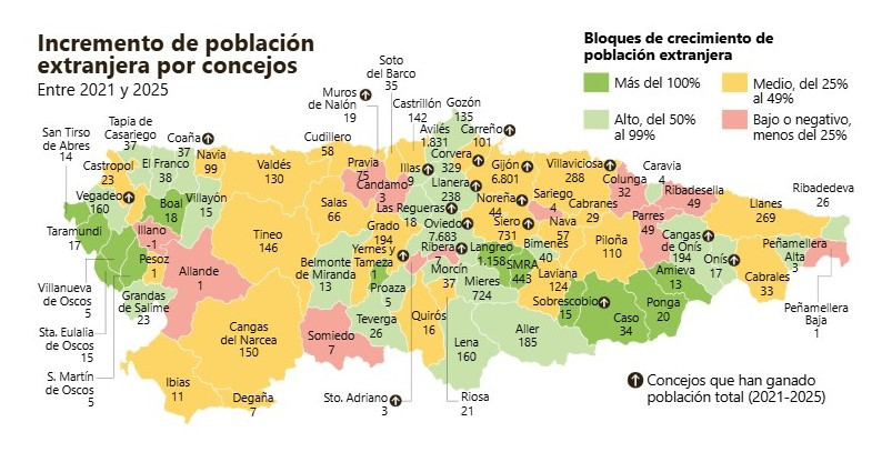 El relevo demográfico no ha llegado a todos los concejos. Pese a que el aumento de extranjeros ha permitido a Asturias superar incluso las cifras de 2021 y revertir en 2023 la tendencia, ese efecto no llega aún a todos los municipios. Aunque la "marea" extranjera se reparte en casi todo el territorio (en mayor o menor medida).