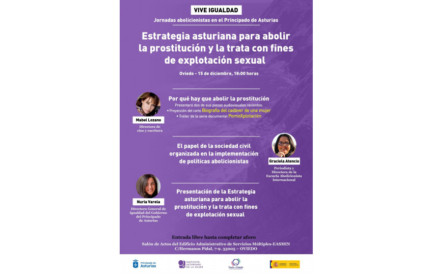 de una mujer”, por la que recibió en el año 2021 el Premio Goya en la categoría cortometraje documental; y el tráiler de la serie documental “PornoXplotación”. También participará Graciela Atencio, directora de la Escuela Abolicionista Internacional, que ha colaborado con el Instituto de la Mujer en la organización de estas jornadas, con la ponencia “El papel de la sociedad civil organizada en la implementación de las políticas abolicionistas”. Esta actividad es gratuita y con entrada libre hasta completar aforo. Tendrá lugar el 15 de diciembre a las 18 h. en el Salón de Actos del Edificio Administrativo de Servicios Múltiples (EASMIN), calle Hermanos Pidal, 7-9, 33005 Oviedo. Esta iniciativa tiene como objetivo sensibilizar a la ciudadanía asturiana sobre los efectos de la prostitución como forma de violencia sexual y desigualdad estructural que sufren las mujeres y niñas, además de recabar propuestas para aplicar políticas abolicionistas en Asturias. La reparación y atención integral de las víctimas, la criminalización de todas las formas de proxenetismo y la penalización de los compradores de sexo, además de la concienciación social, son los pilares del abordaje abolicionista de la prostitución.