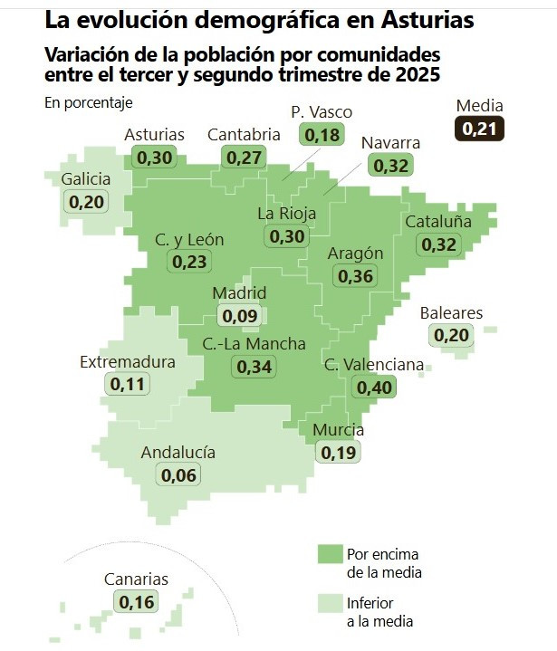 En el tercer trimestre de este año, el Principado ha ganado casi mil nuevos residentes al mes, una cifra inédita que coloca a la región, por primera vez en décadas, entre las comunidades autónomas que aumentan población por encima de la media nacional.
