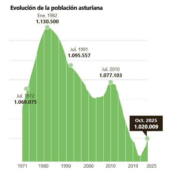 Mientras España mantiene un crecimiento demográfico sostenido, Asturias ha logrado un "estirón" poblacional que sitúa su número de residentes en 1.020.009 personas, una cifra que equivale a la registrada en enero de 2019, cuando el Principado se precipitaba demográficamente con riesgo de caer por debajo del millón de habitantes.